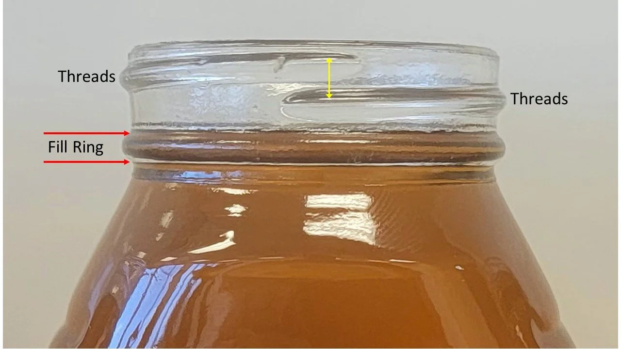 Liquid honey in a circular shape forms a concave surface sometimes referred to as a meniscus. For the purpose of filling jars, the edge of the meniscus should clearly be at the top of the fill ring, without going over.